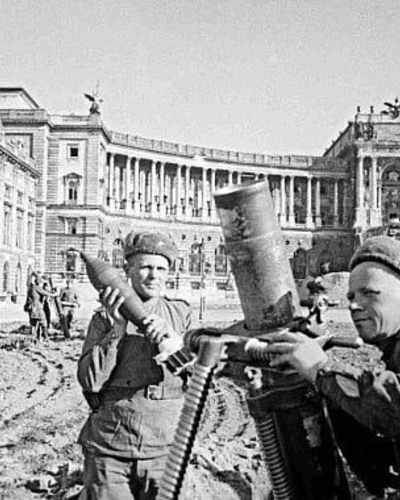 Фото: Советские минометчики ведут огонь по противнику с площади дворца Хофбург в Вене © РИА Новости / Е. Халдей