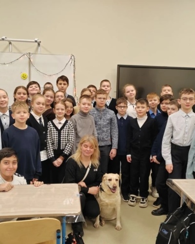 Галина Валентиновна, которая имеет ограниченные возможности по зрению, пришла на урок не одна, а со своим верным помощником – лабрадором-проводником по кличке Юппи. Это сделало встречу особенно наглядной и интересной для школьников.